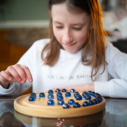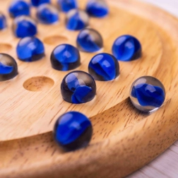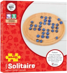 Otkrijte bezvremensku zabavu s drvenim soliterom BIGJIGS TOYS. Sjajne plave kuglice i pažljivo obrađena kružna ploča stvaraju elegantnu logičku igru koja provjerava vašu domišljatost i strpljenje. Cilj je preskakanjem kuglica jednu po jednu ostaviti samo jednu kuglicu na ploči.