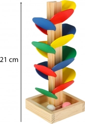 Otkrijte drveno kugličasto stablo MONTESSORI – razigrano pomagalo koje djecu potiče na otkrivanje boja, zvukova i fizike. Spustite kuglicu s vrha i promatrajte kako niz šarene listove klizi prema dolje, pritom razvijajući finu motoriku i koordinaciju oko–ruka. Izrađeno od prirodnog drva, kompaktna visina 21 cm i sjajan poklon za znatiželjnu djecu.