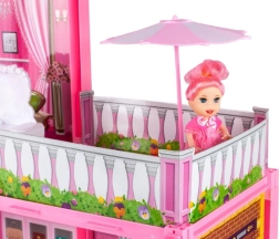 Kućica nudi prostrani balkon s parasolom – idealno mjesto za odmor lutke i vanjsko druženje. Odlično za stvaranje priča i prizora iz svakodnevnog života.