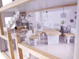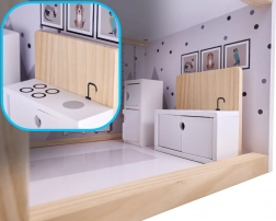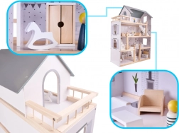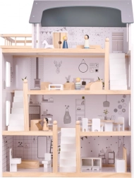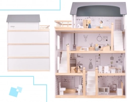 Kuća ima čak četiri kata i nudi mnogo prostora za igru! Drvena terasa na gornjoj etaži daje čitavoj kući poseban šarm. Među brojnim različitim prostorijama nalaze se kupaonica, radna soba, dnevni boravak, blagovaonica s kuhinjskim kutkom i spavaća soba. Svaka od njih je potpuno opremljena i spremna primiti novu obitelj lutaka. Zahvaljujući velikim dimenzijama, unutra mogu stati ne samo najmanje lutke, pa se ne morate brinuti da bi omiljeni prijatelj vašeg djeteta propustio zabavu!