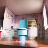 • Bogat set od 9 komada namještaja uključujući kuhinjski blok s umivaonikom, stol, stolice, lampu, ormar, kolijevku i WC.