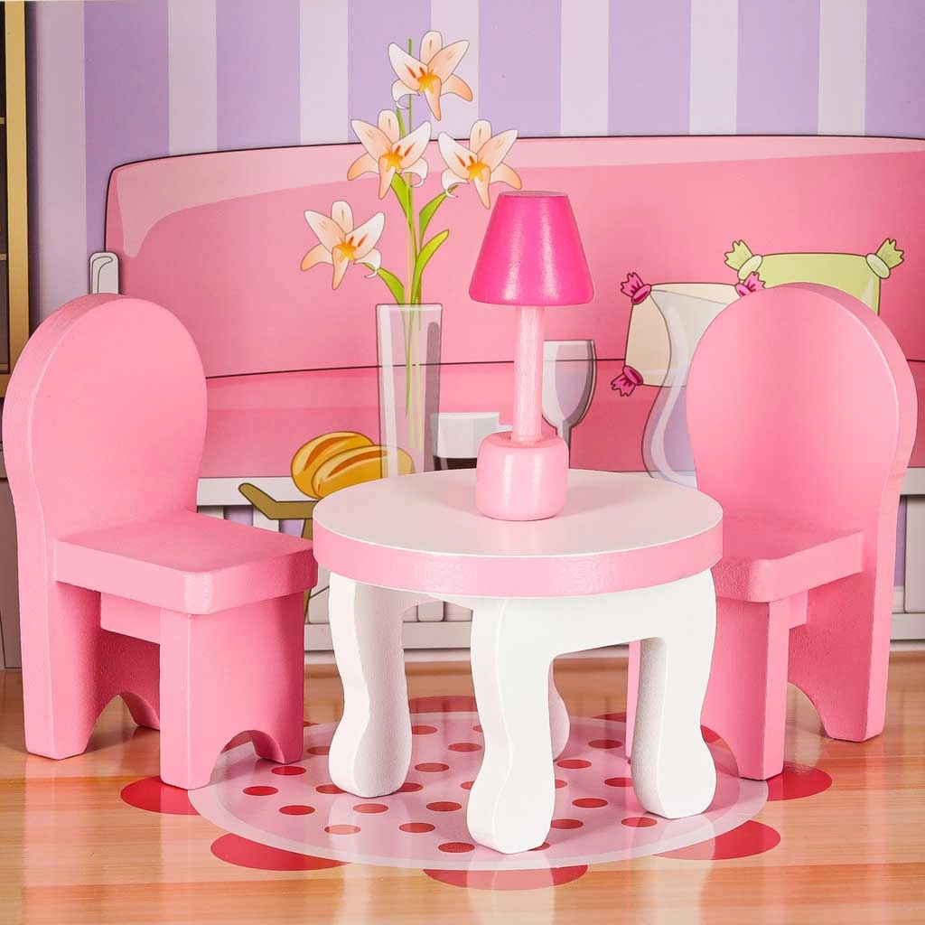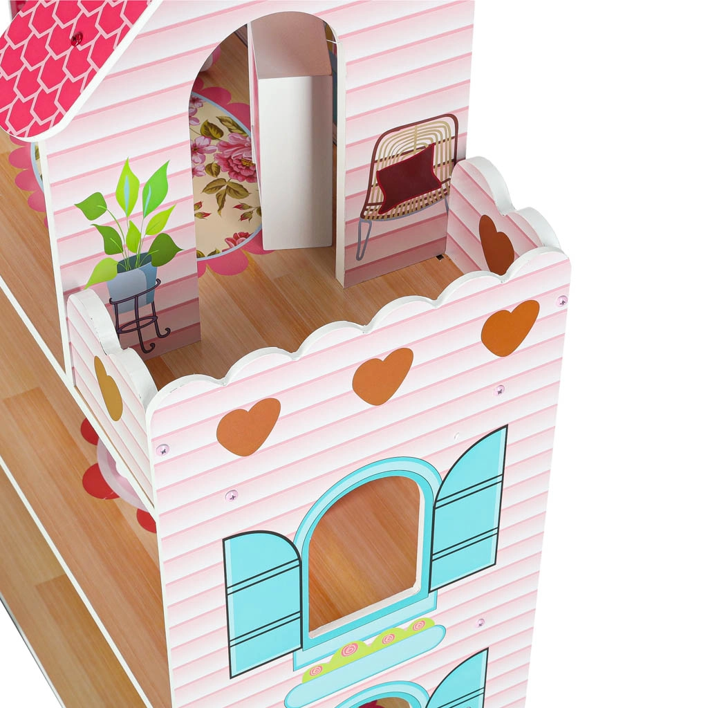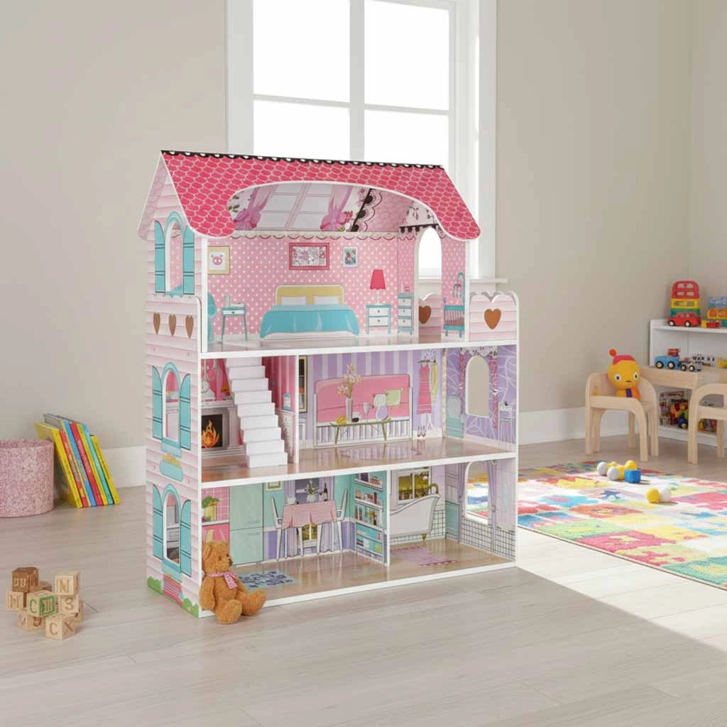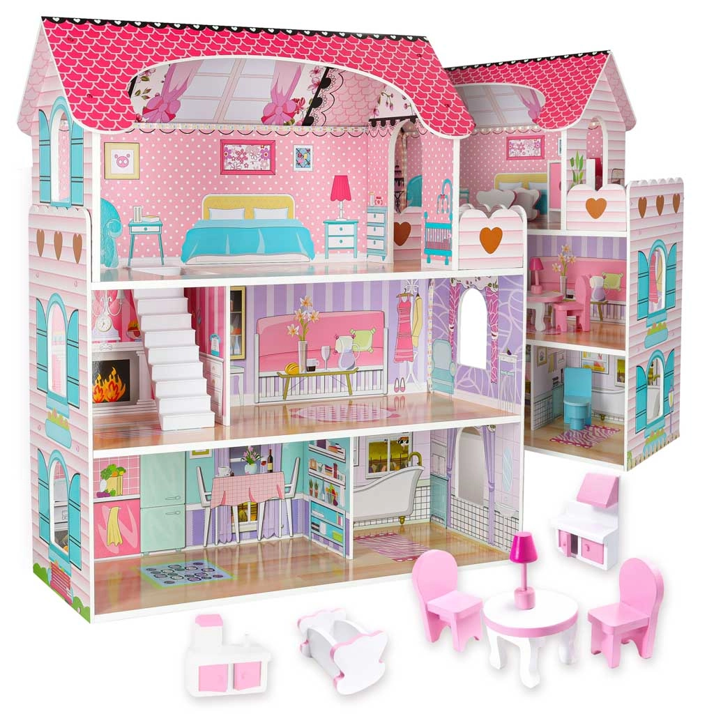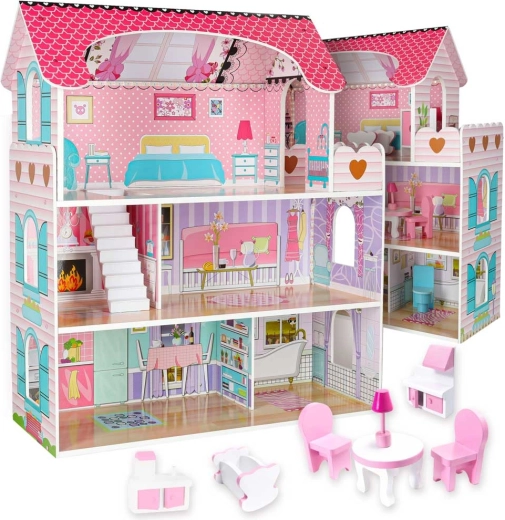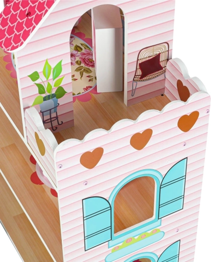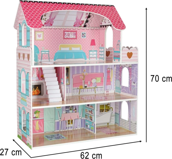 Velika drvena kućica za lutke razveselit će djecu i roditelje. Tri prostrana kata skrivaju kuhinju, kupaonicu, spavaću sobu, dnevni boravak i stubište s balkonom. Bogat set drvenih dodataka i realistični otisci zidova potiču kreativnu igru uloga i razvoj fine motorike.