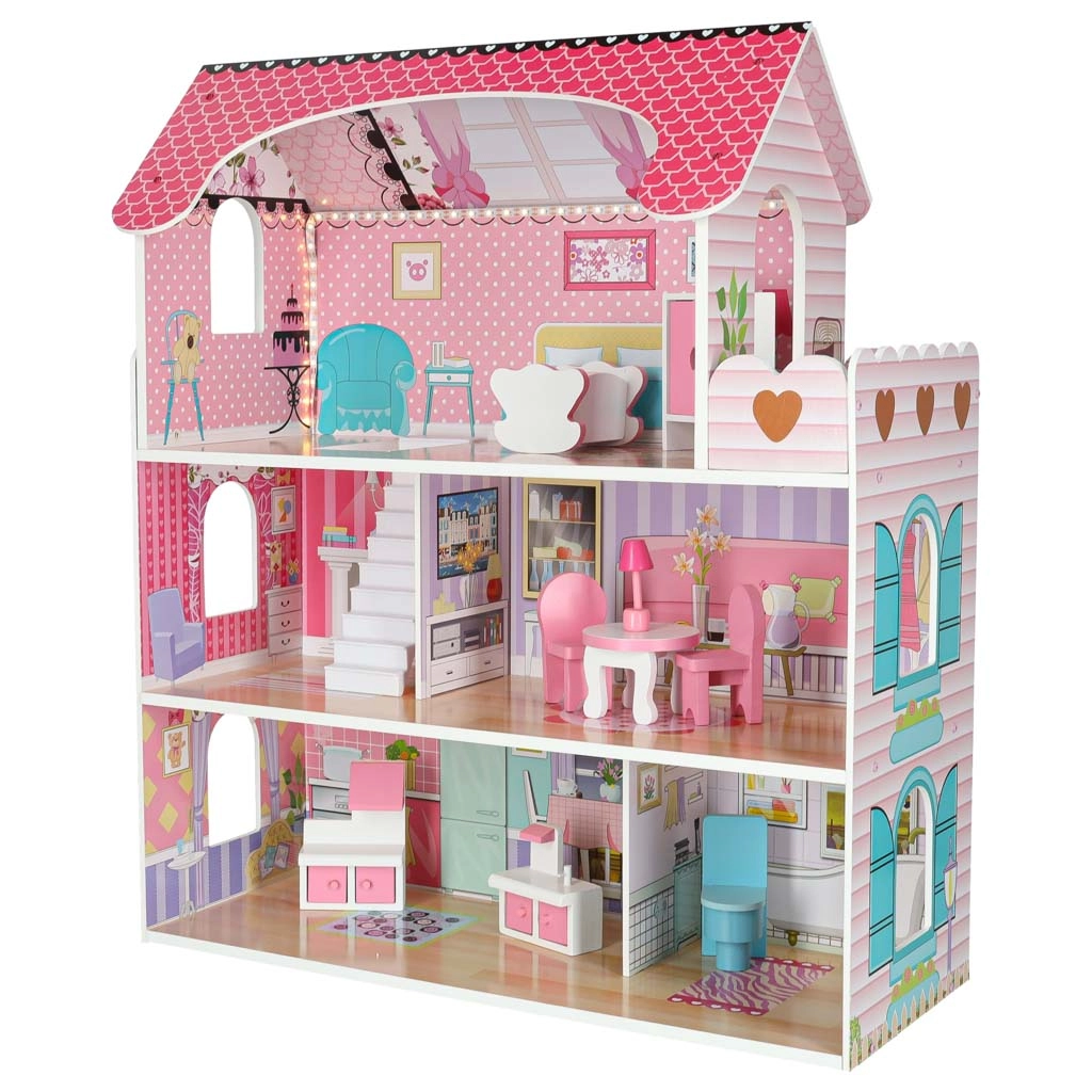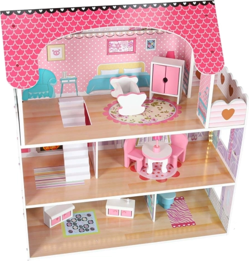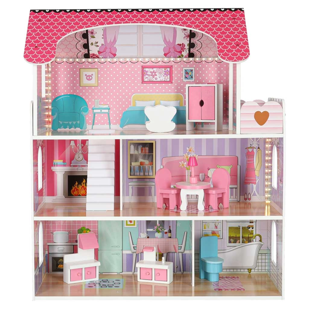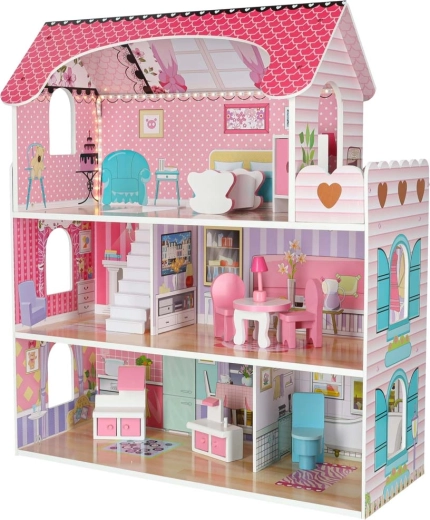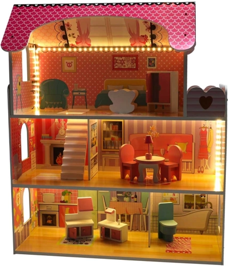 Stilna drvena kućica za lutke visine 70 cm nudi tri kata, 5 udobnih prostorija i terasu. Zahvaljujući LED rasvjeti (hladno bijela) sjaji poput pravog doma i može poslužiti i kao noćna lampica. U kompletu je set drvenog namještaja s vratima koja se otvaraju te detalni otisci zidova za još realističniju igru.
