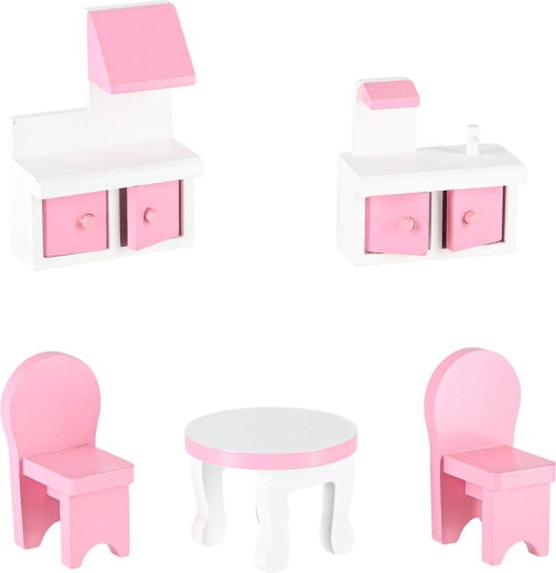 U kompletu su ormarići s vratima koja se otvaraju, kuhinjski blok, stol i stolice, kolijevka, lampa i WC – sve od glatko obrađenog drva s nježnim detaljima.