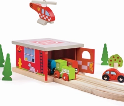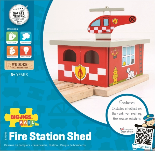 Vatrogasna postaja Bigjigs Rail u potpunosti je kompatibilna s popularnim drvenim željezničkim prugama na tržištu, pa je lako uklopiti u postojeće tračnice. Djeca vježbaju finu motoriku, koordinaciju oko–ruka i kreativnost smišljajući scenarije.