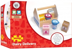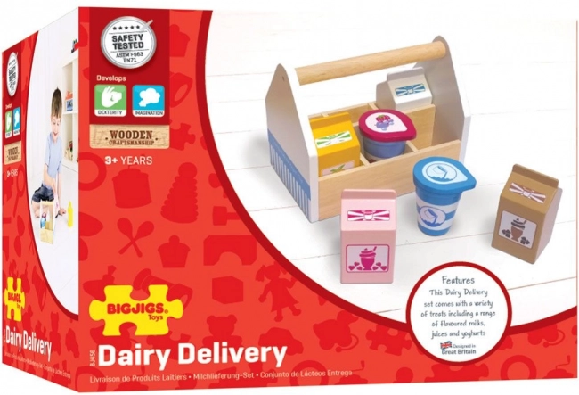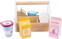 Ova čvrsta drvena nosiljka sadrži četiri kartona napitaka (mlijeko, narančin sok, jagodni i čokoladni shake) plus čašicu jogurta i vrhnja. Idealan dodatak dječjoj kuhinji i trgovini, koji djeci na zabavan način približava osnove zdrave prehrane i podrijetlo namirnica.