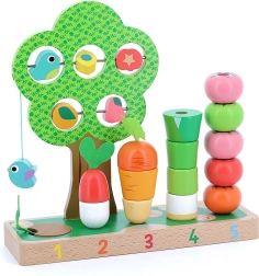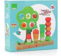 Otkrijte razigrani drveni set Vilac koji djeci pomaže naučiti brojiti, prepoznavati boje i oblike te istovremeno vježbati finu motoriku. Šareni dijelovi povrća i voća stavljaju se na numerirane klince, a kuglice se pomiču po stabalcu – sigurna i izdržljiva konstrukcija idealna je za djecu od 18 mjeseci.