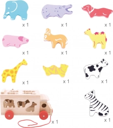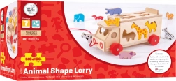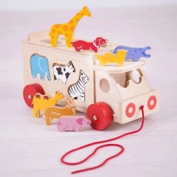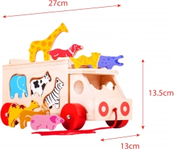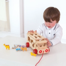 Ovaj kvalitetni drveni kamion sa životinjama kombinira klasičnu umetaljku oblika s pokretnom igrom. Djeca mogu provlačiti životinje kroz odgovarajuće otvore, otvoriti stražnja vrata i krenuti na put povlačenjem za uzicu. Igra prirodno potiče razvoj spretnosti, strpljenja i prepoznavanja boja i oblika.