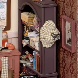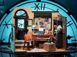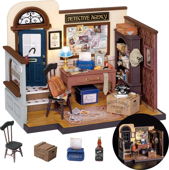 Pisaći stroj, oglasna ploča s tragovima, telefon i šešir – svaka minijatura stvara atmosferu britanske detektivske agencije.