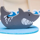 Ovaj drveni set gusarske lađe sadrži sve što malim piratima treba za njihove pustolovine. Paket uključuje kapetana, dva pirata, lađu, sidro, kovčeg s blagom i morskog psa. Sve se igračke komadi mogu praktično smjestiti u lađu, stoga je idealan za putovanja i lako prenošenje.