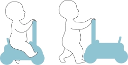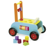 Sa strane se nalaze otvori za umetanje drvenih oblika, na lijevoj strani rotirajući šareni valjci, a ispod naslona šareni rotirajući trokutovi. Sjedeća površina opremljena je trubom sa zvučnim efektima koja djecu zabavlja i motivira na daljnja otkrića. Zbog niske visine sjedišta guralica je udobna i za manju djecu.