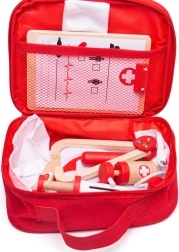 Prijenosni doktorski kovčežić za male liječnike sadrži 10 pažljivo izrađenih alata od drva i tekstila. Podržava kreativnu i maštovitu igru, uči brizi i empatiji, a zahvaljujući praktičnoj torbi s patentnim zatvaračem idealan je i za putovanja. Proizvedeno od kvalitetnih i sigurnih materijala, prikladno od 3 godine naviše.
