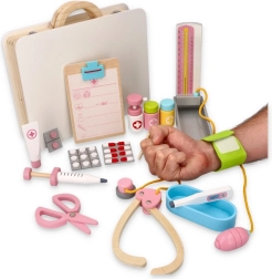 Drveni liječnički set za djecu idealan je za male doktore koji žele otkrivati svijet medicine. Ovaj opsežan set nudi 16 dijelova, pažljivo organiziranih u praktičnom kovčegu, što omogućuje jednostavan pristup i skladištenje. Djeca mogu sama otvoriti kovčeg i po završetku igre sve lako složiti natrag. Ova igračka ne samo da pruža djeci beskrajnu zabavu, već također razvija njihovu finu motoriku i potiče kreativnost.