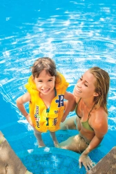 Dječji plivački prsluk INTEX je idealno pomagalo za djecu od 3 godine koja uče plivati. Zahvaljujući svom izražajnom šarenom dizajnu osigurava savršenu vidljivost vaše djece na vodi, što omogućuje roditeljima lako praćenje njihovog kretanja i igre u bazenu, jezeru ili moru.