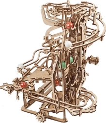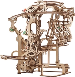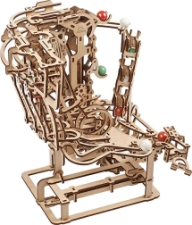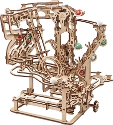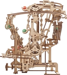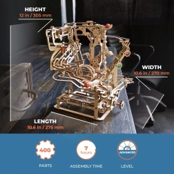 Ova sofisticirana staza za kuglice od kvalitetne šperploče nudi kombinaciju modelarske zabave, edukativne vrijednosti i opuštajućeg prizora. Ručni lančani lift glatko dovodi kuglice na start, odakle kreću kroz tri odvojena segmenta, svaki s jedinstvenom glavnom preprekom. Otvoreni dizajn naglašava funkcionalnu mehaniku i fine detalje.
