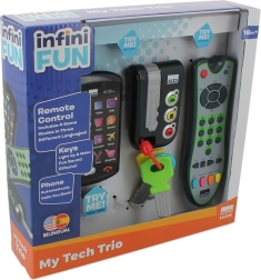 Interaktivni Trio set TECH TOO donosi djeci realistčnu zabavu poput one za odrasle. Sadrži ključeve sa svjetlom i zvukovima, TV daljinski s melodijama i načinima igre te dječji pametni telefon s dodirnim ikonama. Podržava finu motoriku, slušni doživljaj i znatiželju, nudi svjetlosne i zvučne efekte te je izrađen od kvalitetne i sigurne plastike.