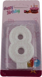 Elegantna rođendanska svijeća u obliku broja 9 s blagim sjajem savršen je odabir za poseban trenutak puhanja svjećica. Zahvaljujući čistom bijelom izgledu i šljokicama, izvrsno se uklapa u različite stilove torti i dekoracija.
