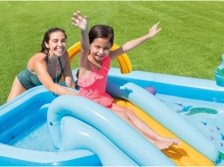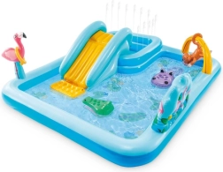 Pretvorite vrt u zabavni vodeni svijet s igraćim središtem INTEX. Široki tobogan s mekanom podlogom osigurava nježno i sigurno prizemljenje, dok plitki brodić i veći bazen pružaju osvježenje u vrućim danima. Integrirana fontana s regulacijom protoka vode daje igri novu dimenziju.
