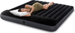 Nafukovajući krevet INTEX dimenzija 183 × 203 × 25 cm kombinira stabilnost i udobnost za goste kod kuće i na putu. Unutarnja konstrukcija Fiber-Tech od tisuća čvrstih poliesterskih vlakana osigurava ravnomjernu potporu tijelu, dok je flock (baršunasta) površina mekana na dodir i sprječava klizanje plahte.