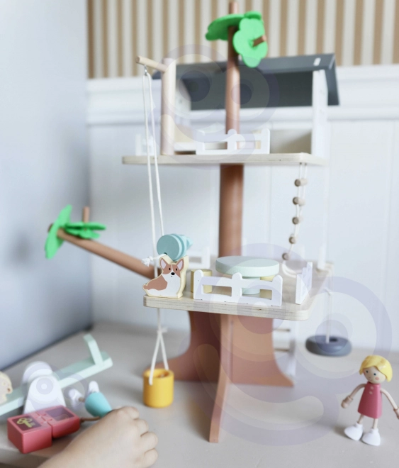 Paket sadrži 31 element uključujući 2 dječje figurice, 2 životinjice i dodatke poput ljuljačke, ljuljačke–gume, balansne ljuljačke, kreveta, stola, stolica i škrinje s blagom. Pažljivo obrađeno prirodno drvo s nježnim bojama izdržljivo je i ugodno na dodir.