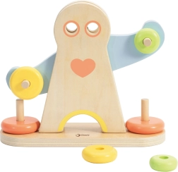 Djeca pomiču prstenove po ramenima figurice i promatraju kako se mijenja ravnoteža. Tako prirodno shvaćaju razliku između lakog i teškog te vježbaju logičko razmišljanje.
