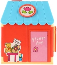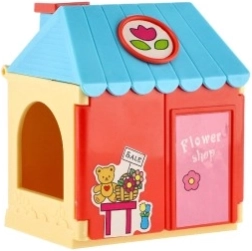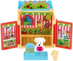 Vesela kućica s cvjetnim motivima i blagajnom uči djecu kombinirati boje, aranžirati i brinuti o kupcima.