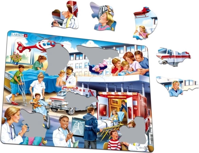 Otkrijte svijet bolnice s pločastim puzzlama LARSEN, gdje djeca upoznaju medicinske sestre, liječnike i pacijente. Zahvaljujući čvrstom rubu i posebnoj podlozi slaganje je pregledno i zabavno, što će cijeniti i mlađa djeca. Svaki dio je nepravilnog oblika, bez klasičnih utora – kao da je slika nježno “raspuknuta”.