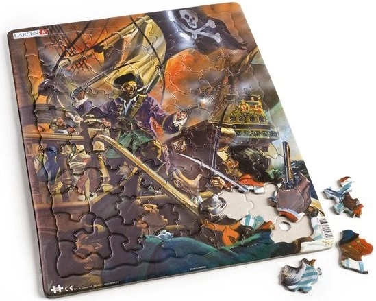 Puzzle LARSEN nude jedinstven način slaganja s nepravilnim dijelovima, koji djecu zabavljaju, a ujedno potiču njihovu kreativnost i vještinu. Čvrst rub i otvori s donje strane osiguravaju lako slaganje i vađenje dijelova. Piratski motiv je vizualno privlačan, a svaki je dio originalan!