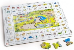 Larsen Puzzle Engleski namijenjena je svima koji vole učiti na zabavan način. Na livadi iza sela ili kod ribnjaka možete otkriti razne likove i predmete potrebne za kampiranje. Pojedinačni dijelovi sa slikama pridružuju se abecedno poredanim engleskim nazivima na rubu slagalice.