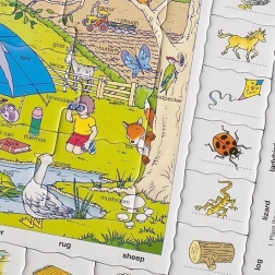 U sredini slagalice nalazi se 18 klasičnih dijelova s cjelovitom scenom koja uključuje obrazovne riječi i njihove engleske nazive. Svaki dio ima jedinstven oblik, što znači da slagalicu možete složiti samo kada su svi dijelovi na pravom mjestu. Čvrst rub olakšava slaganje, a otvori s donje strane omogućuju jednostavno vađenje dijelova.