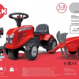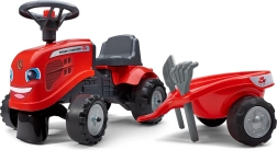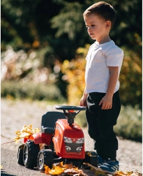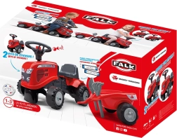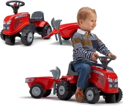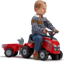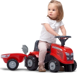 Mali vozni traktor FALK BABY MASSEY FERGUSON s odvojivom prikolicom razveselit će djecu od 12 mjeseci. Nudi stabilnu i sigurnu vožnju, trubu na volanu, odvojivu prikolicu i izdržljiva plastična kotača. U paketu su i igračke – lopatica i grablje te dva seta naljepnica za personalizaciju izgleda.