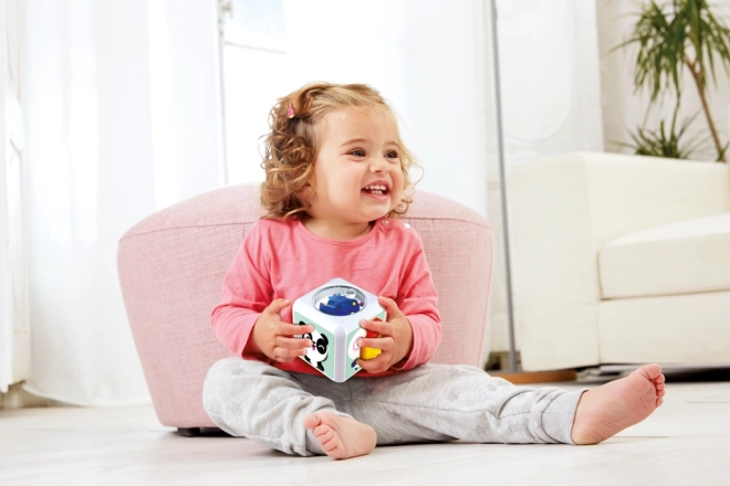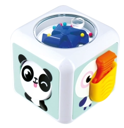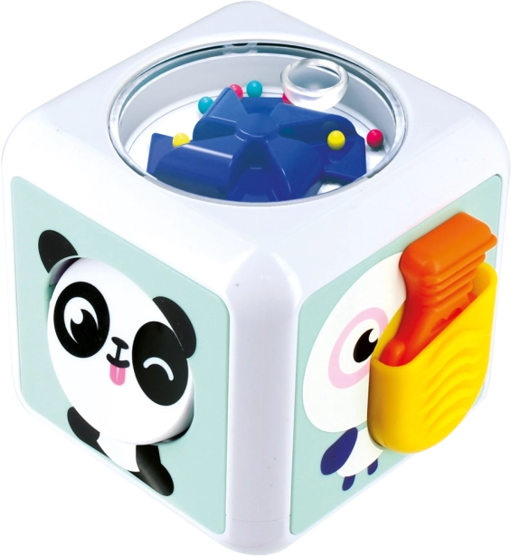 Ova senzomotorička kocka je dizajnirana kako bi poticala osjetilno opažanje djece. Sadrži različite teksture, gumbe, ogledalca i pokretne dijelove koji stimuliraju dodir i vid djeteta.