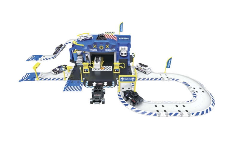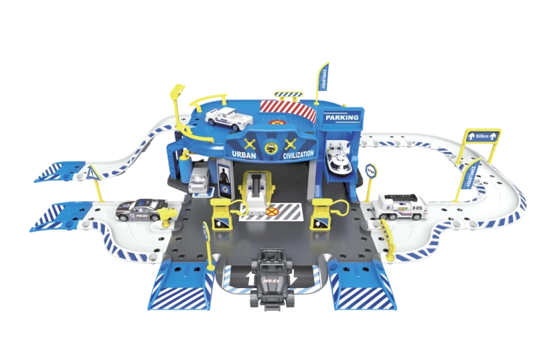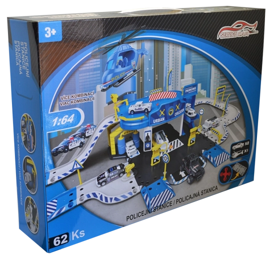 Policijska postaja garaža s priborom (set od 62 kom) Dimenzije garaže nakon sastavljanja: 83,2 × 45,2 × 20 cm Sadržaj seta: policijska postaja s garažom, metalni model autića 1:64 (6 kom) i helikopter