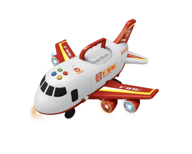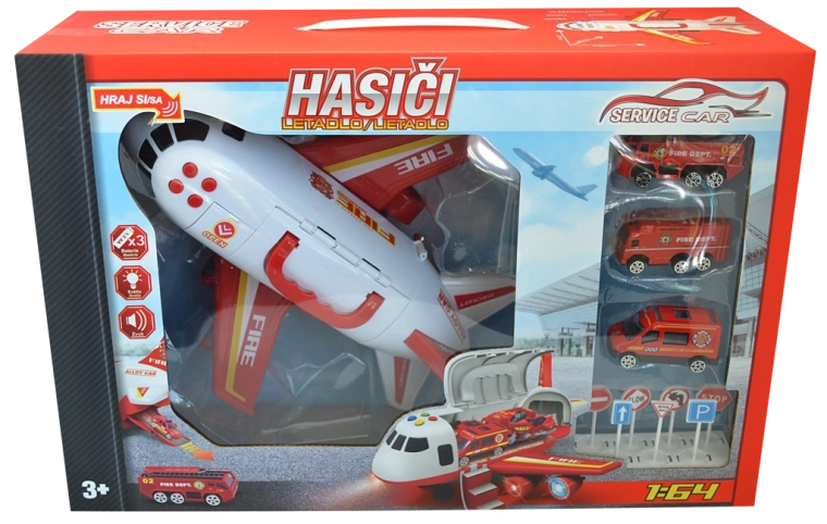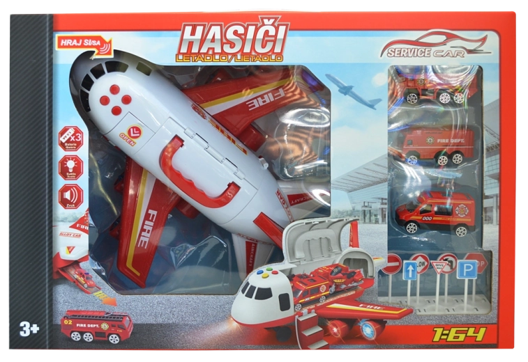 Avion Vatrogasci set s priborom (set). Dimenzije garaže nakon rasklapanja: 25 × 28 × 30 cm, tipke za zvučne i svjetlosne efekte, vožnja na zamašnjak. Sadržaj seta: vatrogasni avion/garaža 2-u-1 (funkcija pretvaranja iz aviona u garažu i natrag) i metalni model autića 1:64 (3 kom).