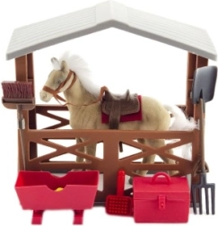 Otkrijte čaroliju farme s ovim realističnim setom za male ljubitelje konja. U paketu je plastični konj s plišanom završnom obradom, sjedlo i uzda, praktična štala te bogati dodaci za njegu i igru. Idealno za kreativnu i maštovitu igru djece od 3 godine.