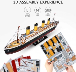 Uživajte u detaljnoj izgradnji legendarnog parobroda TITANIC. 3D slagalica sa 266 dijelova brenda CubicFun nudi realistične detalje i atmosferu naglašenu integriranim LED osvjetljenjem. Dijelovi su izrađeni od oko 3 mm debele pjene presvučene laminiranim tiskanim papirom – izdržljivi, precizno pristaju i ugodni za slaganje.