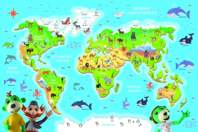 Edukativne puzzle za djecu s kartom svijeta i životinjama koje djecu uče geografiji na zabavan način. Sadrži opise na češkom jeziku.