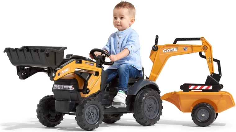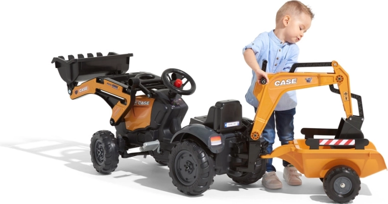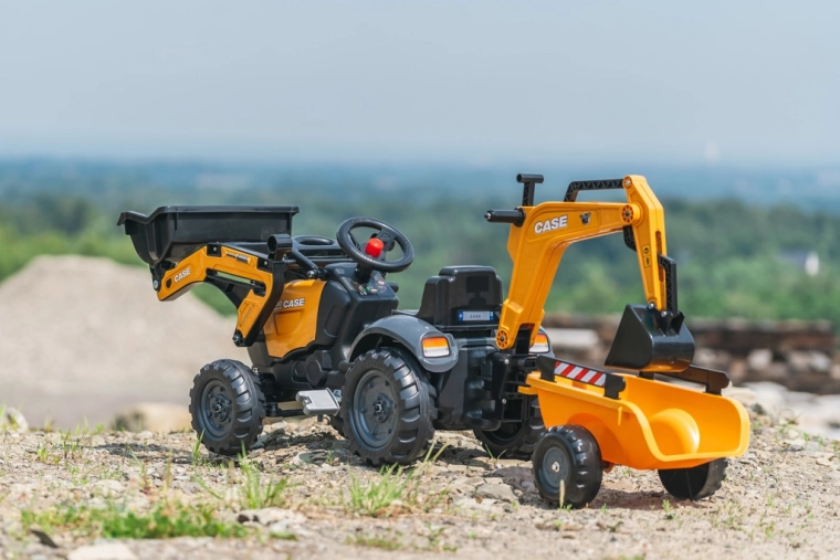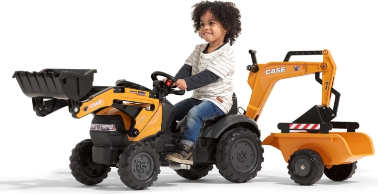 Ovaj realističan guralni traktor CASE savršen je pratitelj za igru na otvorenom, u vrtu i pješčaniku. Djecu će oduševiti pokretna prednja žlica za utovar pijeska ili zemlje te stražnji bager kojim se upravlja s okretne sjedalice. Odvojiva prikolica lako će prevesti sve “blago” s gradilišta. Zahvaljujući stabilnoj konstrukciji i izdržljivoj plastici spreman je za svakodnevne pustolovine.