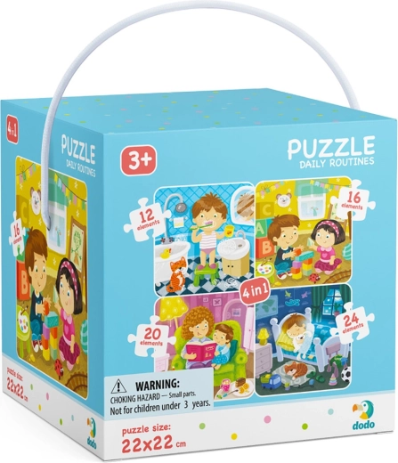 Dječja slagalica marke DODO s ilustracijama dnevnih aktivnosti. Dimenzije slagalice nakon sastavljanja: 22×22 cm. Dob: 3+
