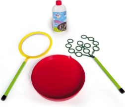 U pakiranju ćete pronaći dva obruča – jedan za divovske mjehure i drugi za mnoštvo sitnih mjehurića, zatim crvenu zdjelu za praktično namakanje i 0,5 l punjenja. Idealno za obitelijska popodneva, proslave i igre na otvorenom.