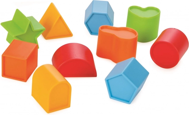 Set šarenih geometrijskih dijelova potiče razlikovanje oblika i boja te uči djecu rješavati jednostavne zadatke umetajući ih u odgovarajuće otvore.