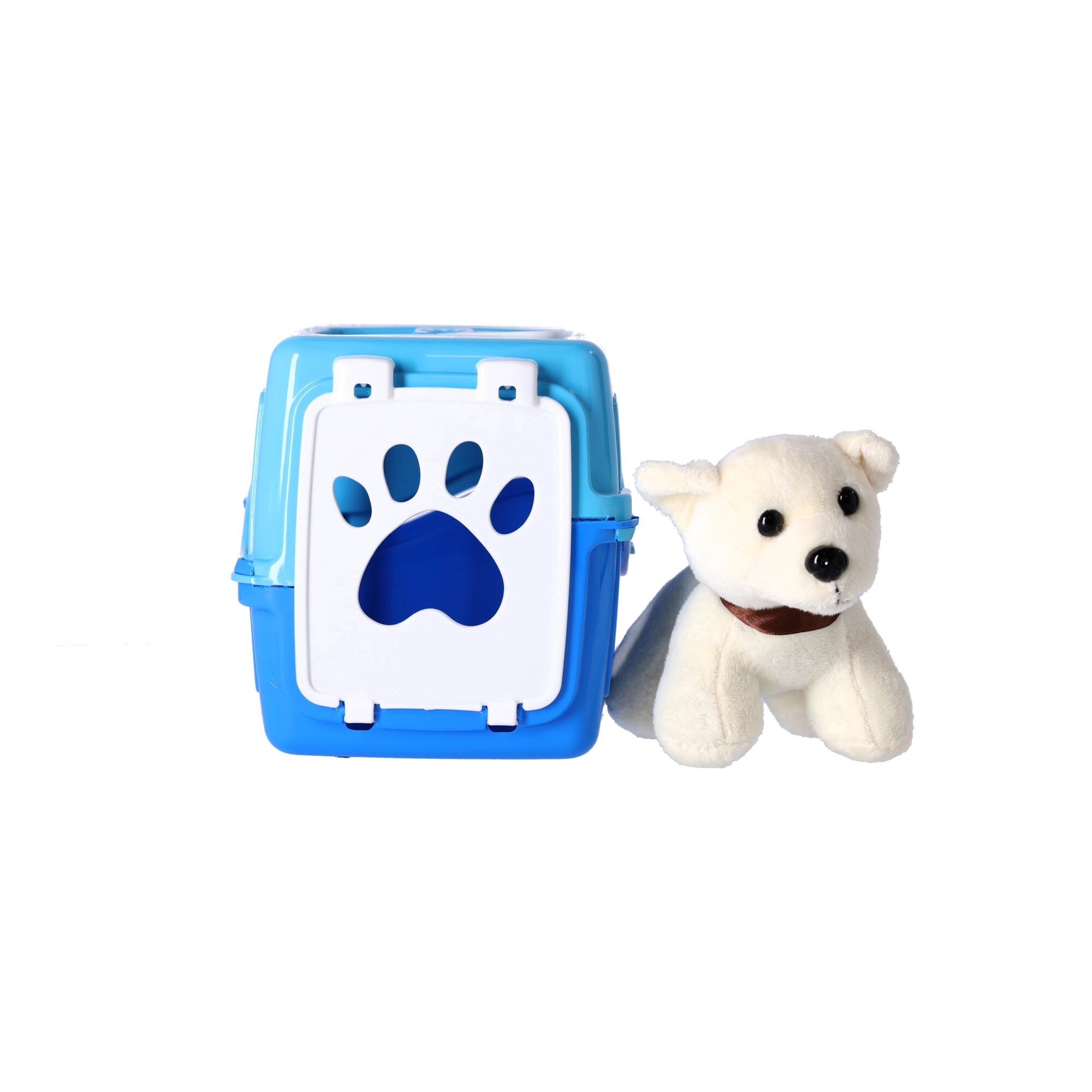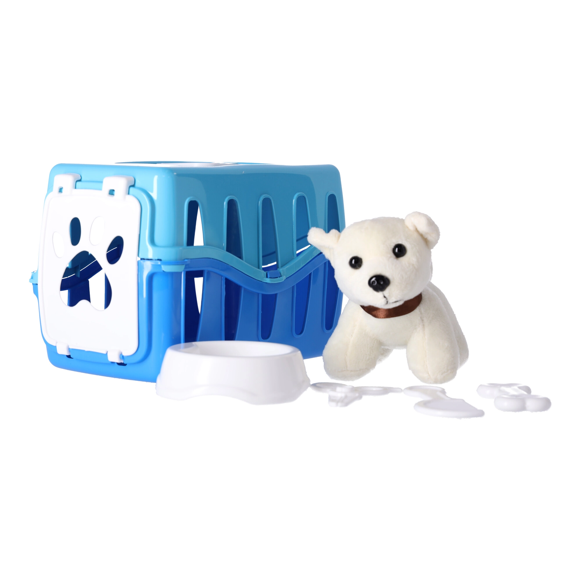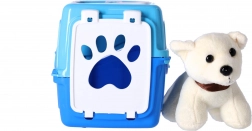 Psić u plavoj transportnoj kutiji. Igraći set sadrži plišanog psića, kutiju, zdjelicu, škare, kost. Zadovoljava najstrože EU norme. Proizvedeno od zdravstveno ispravnog materijala.