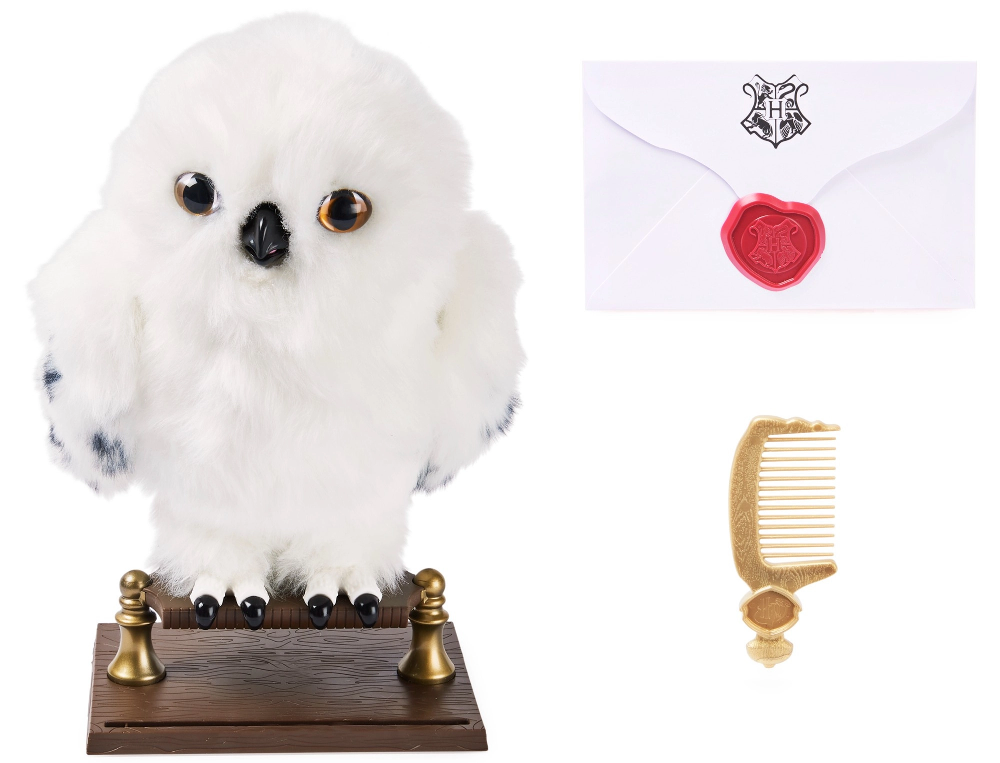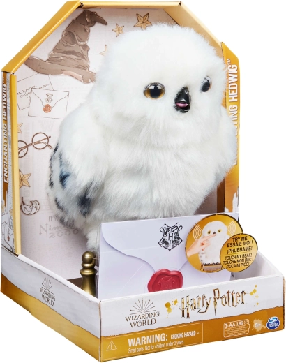 Otkrijte vjernu plišanu sovu koja oživljava na dodir. Hedviga ima mekano bijelo „perje“ s nježnim točkicama na krilima, realistične oči i otvarajući kljun koji pokreće čarobne zvučne efekte i pokrete. Savršena za maženje, izlaganje i maštovitu poštu iz Hogwarts.