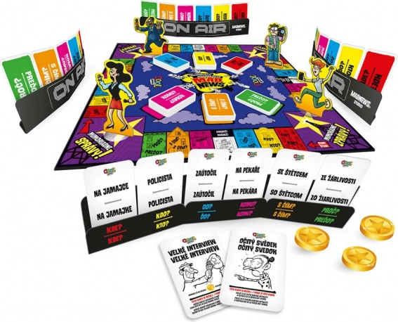 - Ploča za igru, 6 setova karata AKTUALNOSTI, 6 figurica reportera, 1 ploča za igru, 1 pješčani sat (30 sekundi), 6 novinskih studija, upute