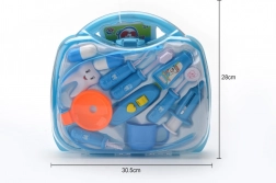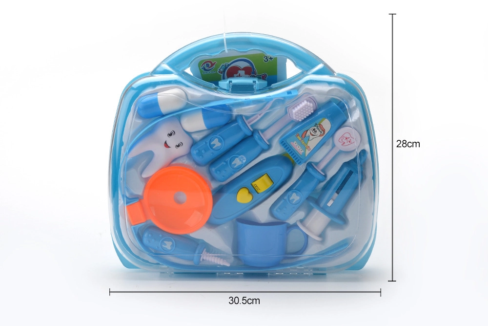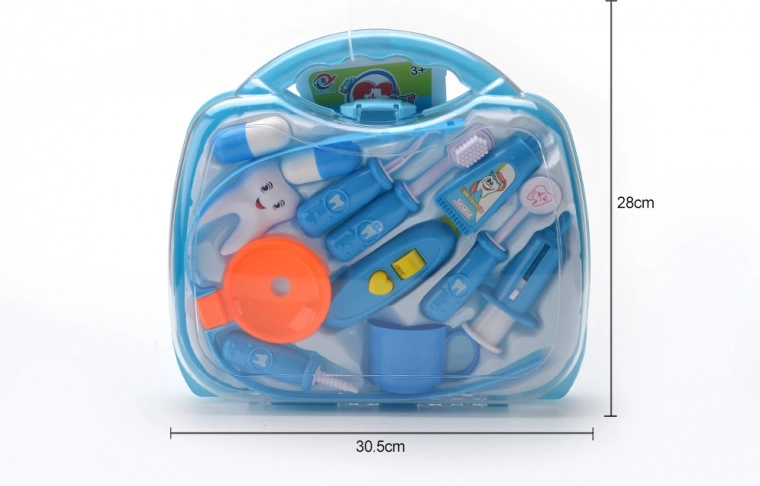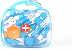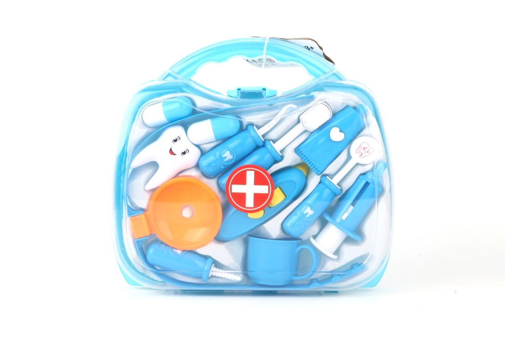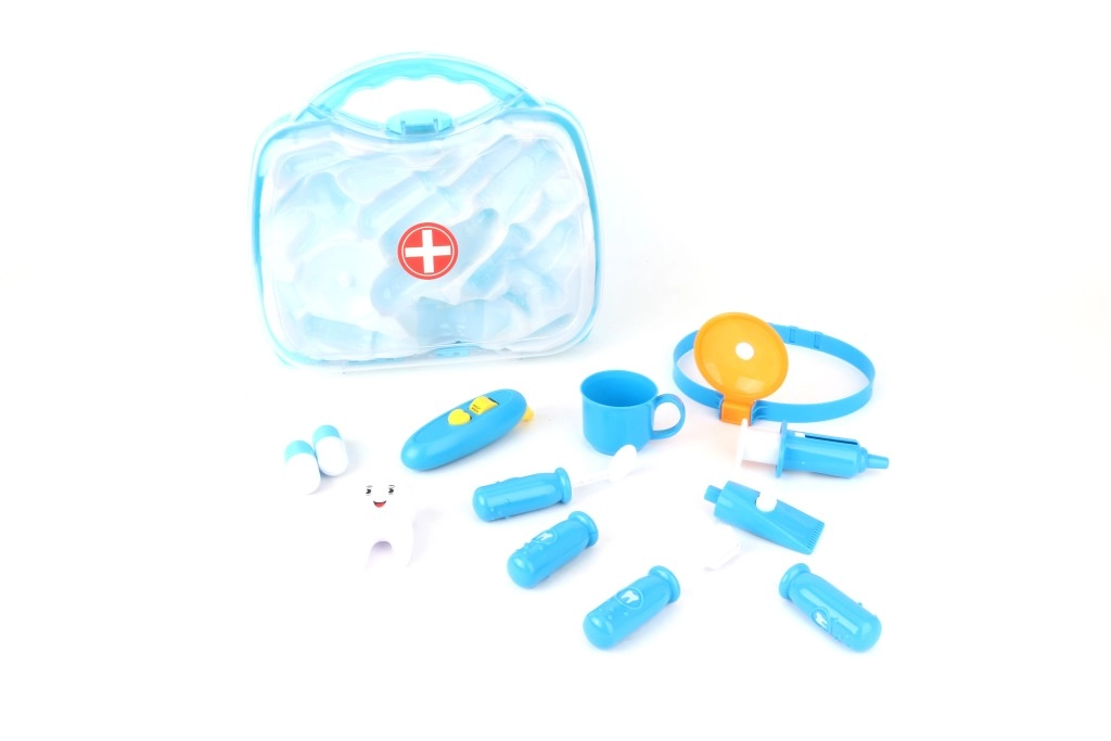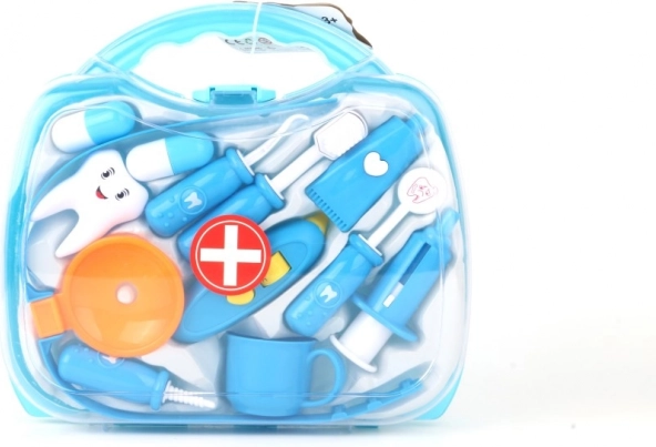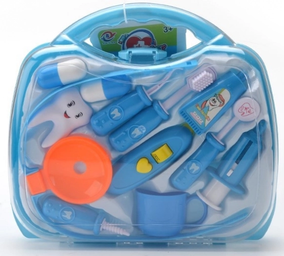 Prozirni plavi kovčežić skriva razne stomatološke pomagala, uključujući četkicu, „pastu“ i zubni model. Odlično za uvježbavanje higijenskih navika i kreativnu igru zubara.