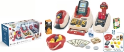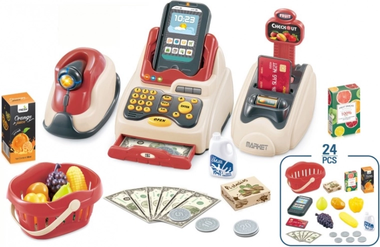 Set sadrži sve što je malom trgovcu potrebno: blagajnu s tipkama, čitač kartica, platni terminal za bezgotovinsko plaćanje, košaricu za kupovinu, igračke-novac i raznolik izbor proizvoda za „kupnju”. Idealan za role-play, razvoj komunikacije i suradnje s prijateljima.