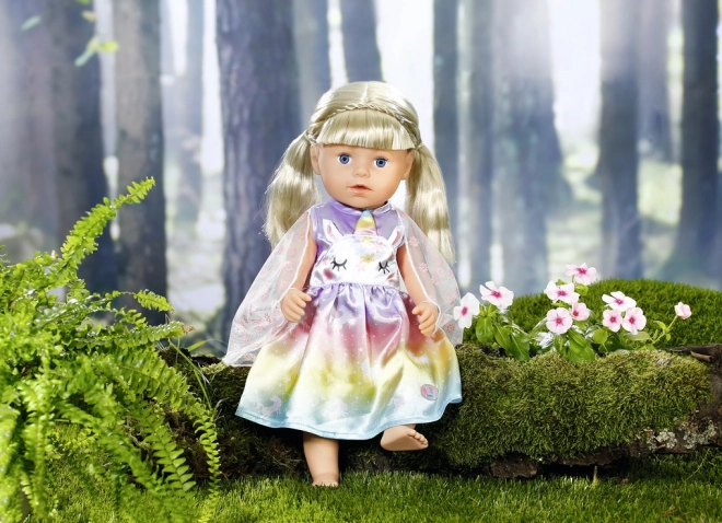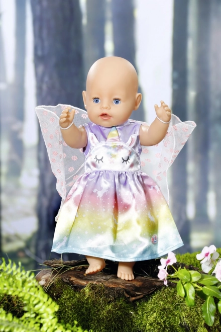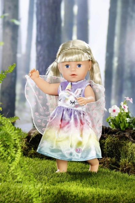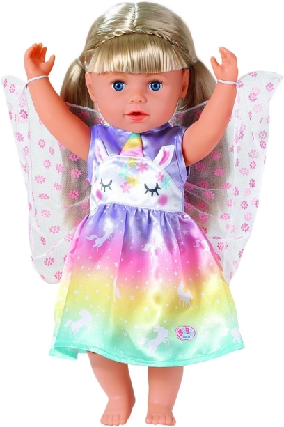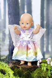 Vile i jednorogovi pripadaju jedno uz drugo kao mlijeko i keksi. Vilinska haljinica za lutku BABY born sašivena je od prekrasne tkanine u duginim bojama. Suknjica je otisnuta čarobnim jednorozima koji plešu zvjezdanim nebom. Gornji dio haljinice sprijeda je ukrašen licem jednoroga s našivenim uškama i šarenim rogom. Prava vila, naravno, mora imati i krilca. Prozirna krilca sa svjetlucavim cvjetićima ušivena su u stražnji dio haljinice, a čim BABY born provuče ruku kroz malu petlju u gornjem dijelu krilaca, ona se otvaraju. Originalna odjeća za lutke BABY born. Za maštovitu, raznoliku i dugotrajnu igru. BABY born Bajkoviti kostim Jednorog za lutke veličine 43 cm. U kompletu je i vješalica.