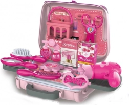 Otkrijte stilski modni kovčeg koji sadrži sve potrebne dodatke za svaku malu modnu dizajnericu. Kovčeg uključuje sušilo za kosu, škare i druge sjajne alate.