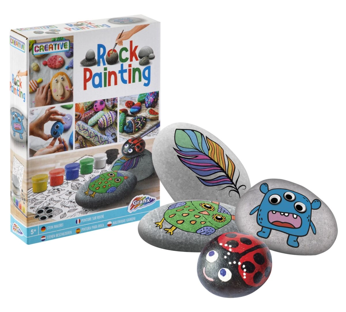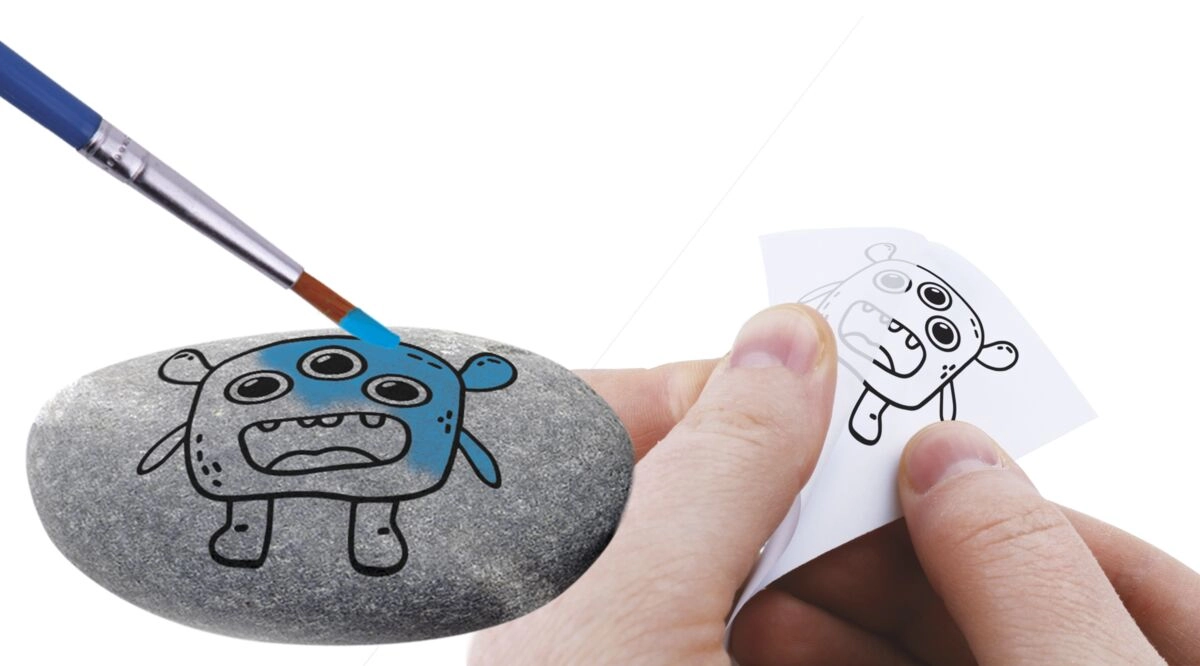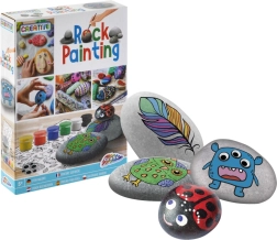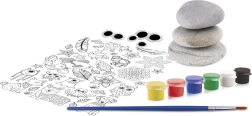 Ovaj kreativni set pretvara obične kamenčiće u vesele čudoviščiće, ribice, lica i druge originalne dekoracije. Dovoljno je zalijepiti motiv s naljepnica, dodati pomične oči i ukrasiti šest snažnih boja. Zahvaljujući priloženom kistu i glatkim oblutcima, djeca će izraditi prekrasne radove i bez prethodnog iskustva.