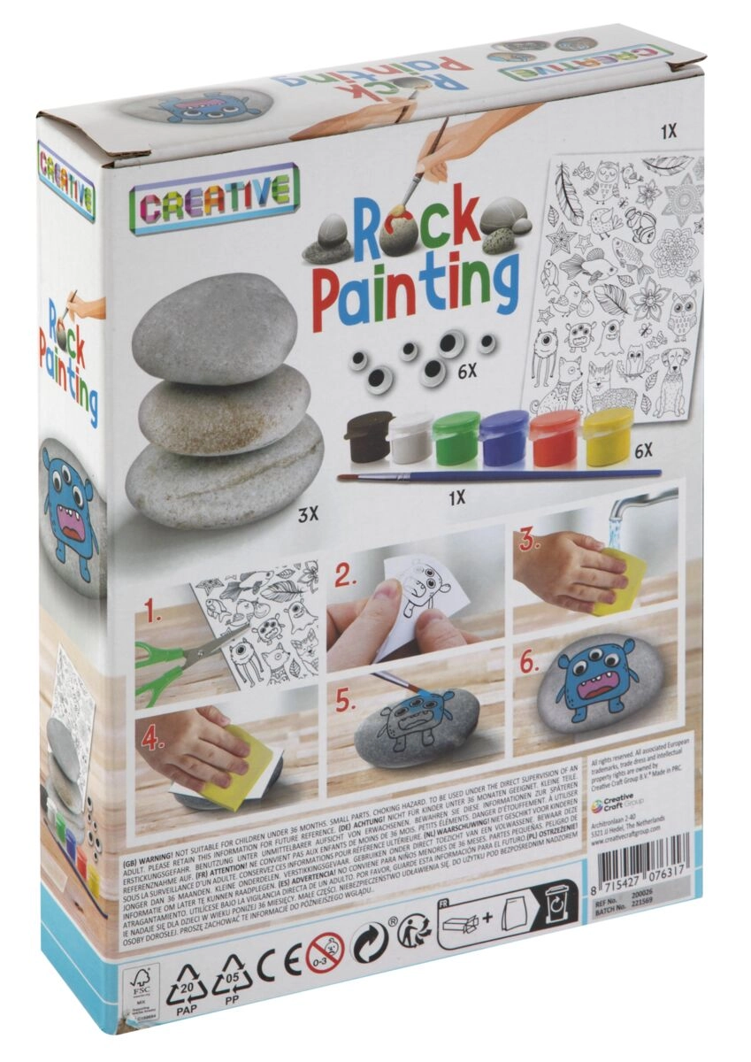 Otkrijte zabavno stvaranje za djecu s kreativnim setom za oslikavanje oblutaka! U pakiranju je sve potrebno – glatko kamenje, boje, kist, naljepnice i pomične oči – za jednostavno i radosno stvaranje. Idealno za razvoj mašte, fine motorike i zajedničke obiteljske trenutke. Jednostavna uporaba, šarena kreativnost i odlično poklon-pakiranje.